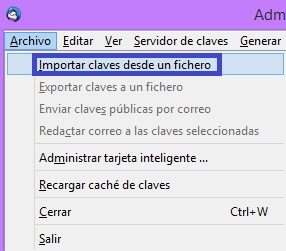 Para enviar el correo encriptado necesitarás la clave pública de tu contacto. Puedes añadirla desde el Menú Enigmail en la sección Administración de claves. Una vez en ese apartado, accedemos a Archivo e Importar claves desde un fichero: