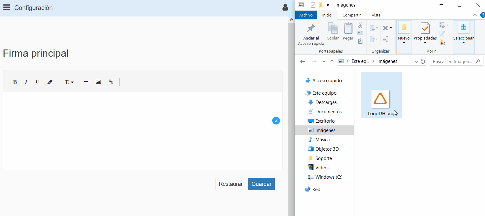 Recuerda que también puedes añadir imágenes a la firma, desde el icono con un paisaje en la barra de herramientas, desde ese apartado podrás añadir la imagen o una URL, o simplemente arrastra al campo firma la imagen que quieres configurar.