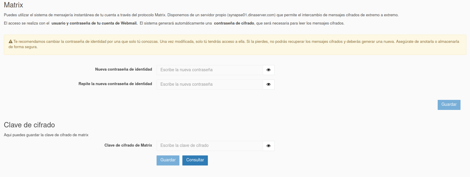 Este apartado de las opciones de Webmail se utiliza para dos funcionalidades relacionadas con Matrix Chat que son las siguientes: